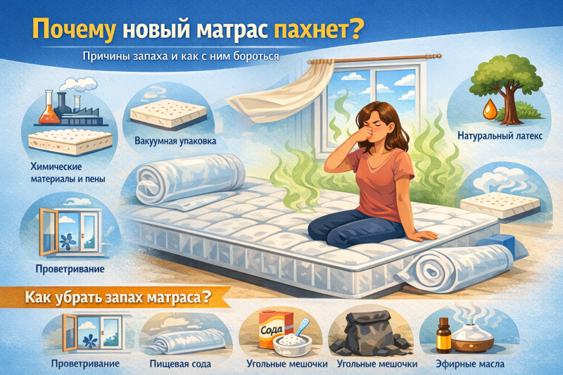 Новый матрас может пахнуть из-за упаковки и технологических материалов — чаще всего это временно. Проветривание и простые методы вроде соды или угля обычно снижают запах быстрее. Если запах не уменьшается, усиливается или вызывает выраженный дискомфорт — обратитесь к продавцу/производителю.