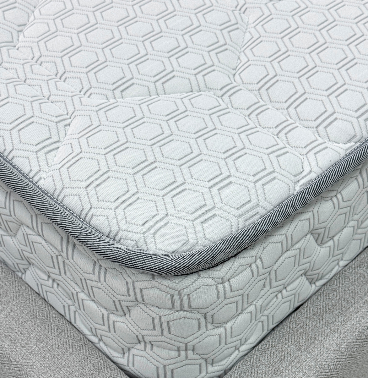 Трикотаж «Carbon» — современный и стильный материал с оригинальным рельефным рисунком «соты», который придаёт матрасу эффектный и премиальный вид. Высокая плотность ткани гарантирует её прочность и долговечность, а эластичная структура обеспечивает идеально ровное прилегание к наполнителю, сохраняя гладкость поверхности на протяжении всего срока службы. Материал обладает хорошей воздухопроницаемостью, что помогает поддерживать комфортный микроклимат во время сна, и устойчив к износу, сохраняя свой внешний вид даже при длительной эксплуатации